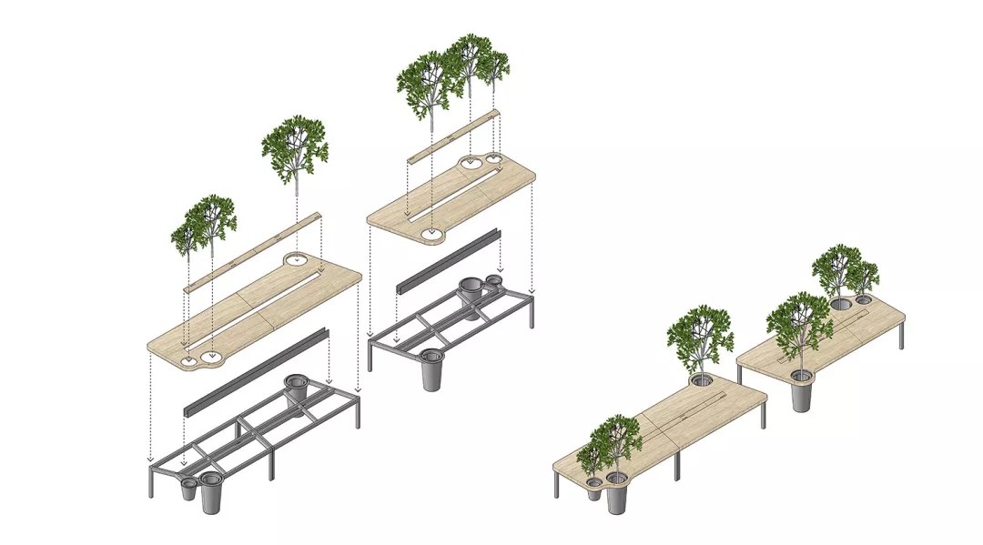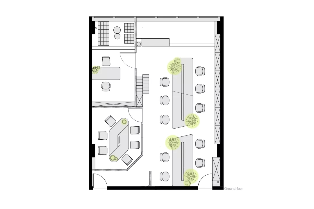 同時我們希望有一個張別具一格的會議桌,但是會議桌極強的功能性使得難以去進行改變。于是,會議室空間本身的形狀缺陷成了這張桌子想法的起點。由于避讓入口玄關,會議室空間有一個角是切掉的,墻壁是斜著放置,如果是長方形的會議桌,就必然在這個斜墻前造成使用空間不夠缺陷,無法坐人.所以就產生了一個平行四邊形的會議桌,斜邊與空間的斜墻平行,也讓整個斜墻前的空間可以坐下一個參會者,再嵌入一些小草,一張獨特又實用的會議桌就出來了。