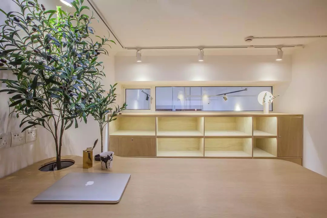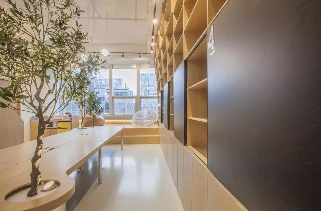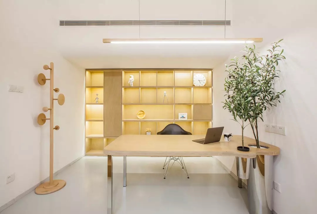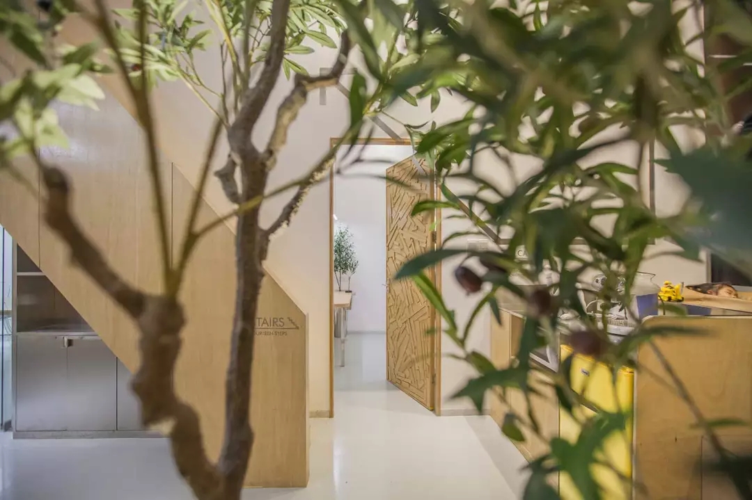辦公桌與樹的結合,成為了整個空間的內景觀,也與外面的綠色形成呼應,消減以往辦公的緊張氛圍。整墻的書架也不甘無趣,在實用的框架下,產生一絲波動的起伏,如同山崖,如同坡面。
