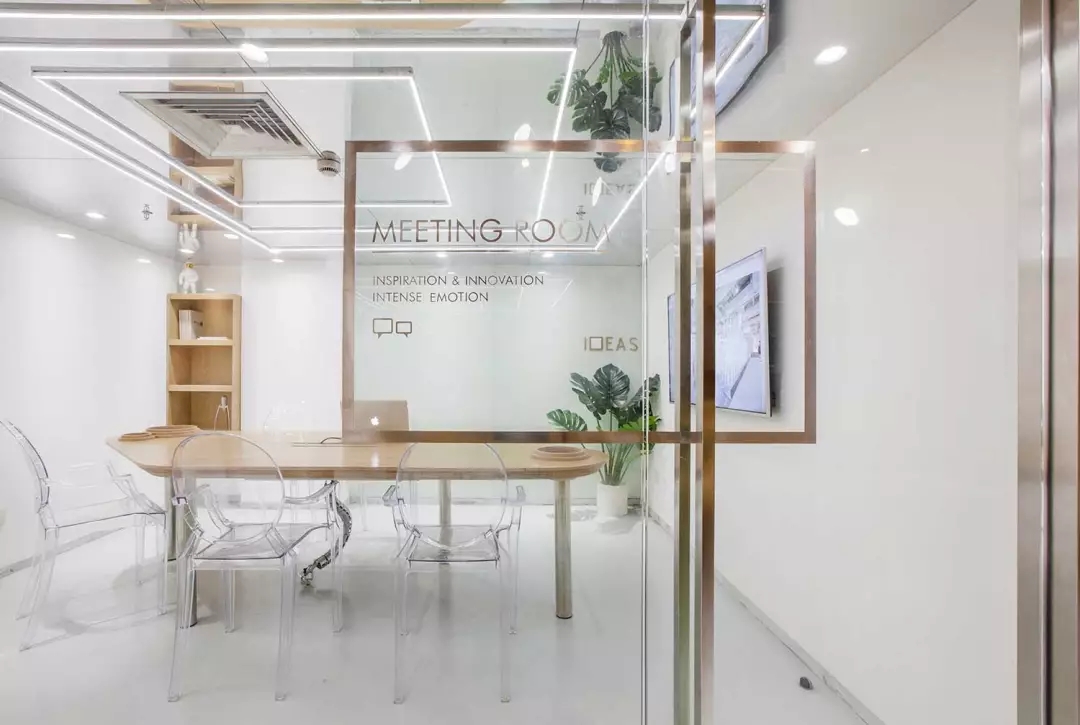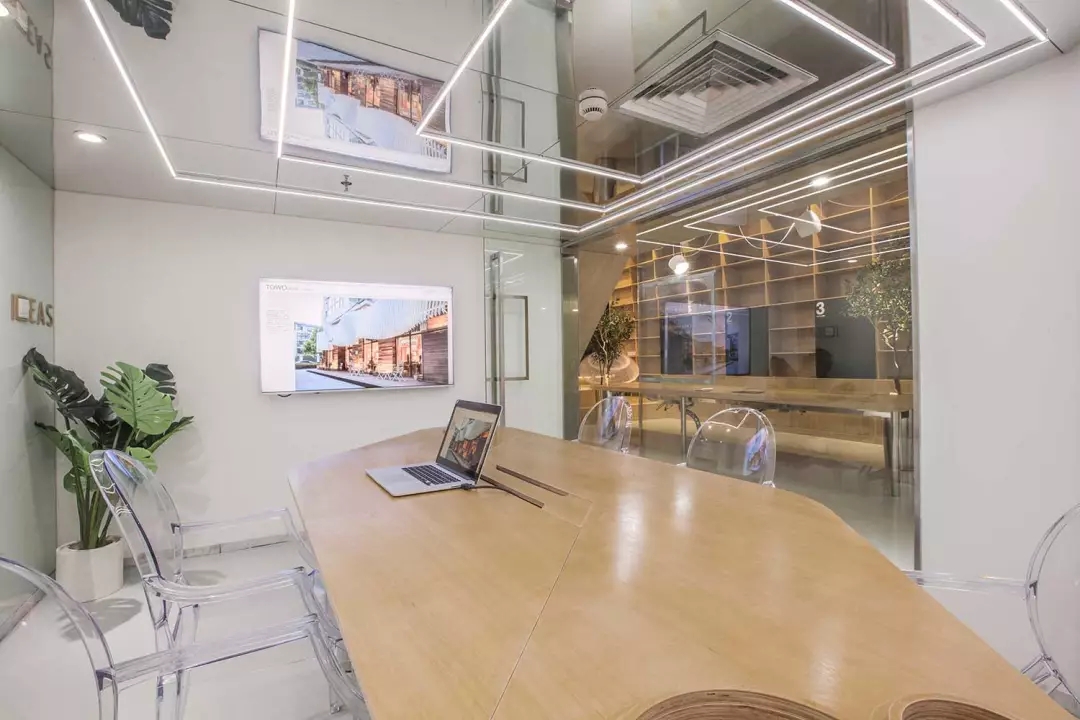 由于層高的限制,會議室感覺比較壓抑,所以將整個天花變?yōu)殓R面,化解的層高的局限,也讓空間感別具一格.但是空調的出風散流器非常扎眼,空調的位置決定了風口位置無法移動。而市面上又找不來合適的可以符號化的替代品,于是,就順勢而為,將會議室的照明以散流器為中心進行布置,讓散流器的方框與燈光呼應起來,形成了會議室有意思的圖形。