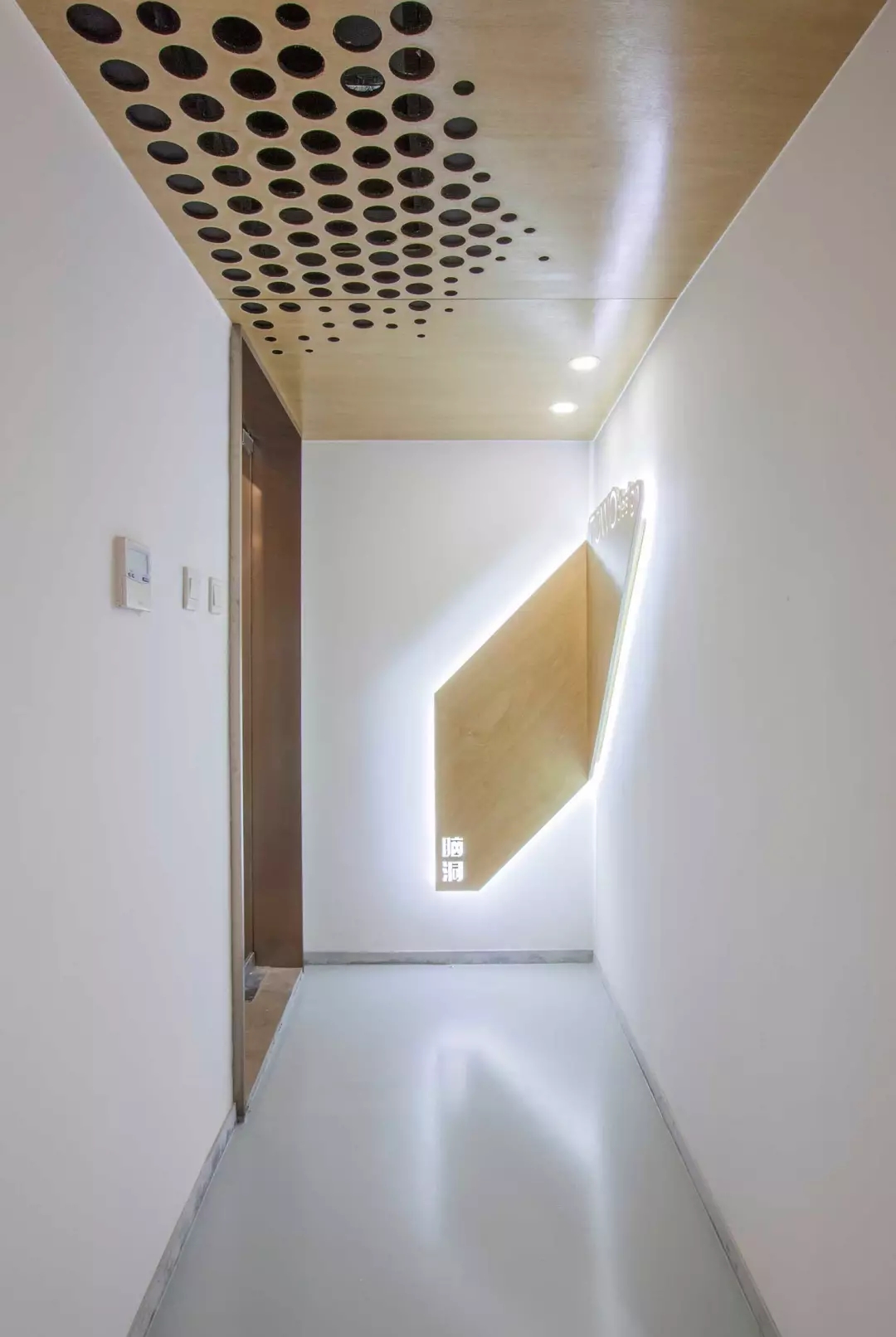 功能融于樂趣與創(chuàng)意,兩個空調的回風孔也不能放過,市面上的百葉口為了實用而完全無法融入環(huán)境。由于吊頂也屬于木質體塊,所以經過試驗,一個充滿漸變的點陣圖形,解決了這個問題,不同規(guī)格的開孔器進過精心布置并開洞,讓空間回歸純粹與樂趣。