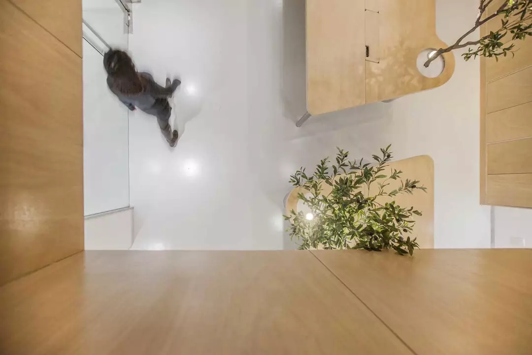 ▲交錯的樓梯節(jié)省了樓梯的長度,避開了頭頂的橫梁,順帶凹個造型