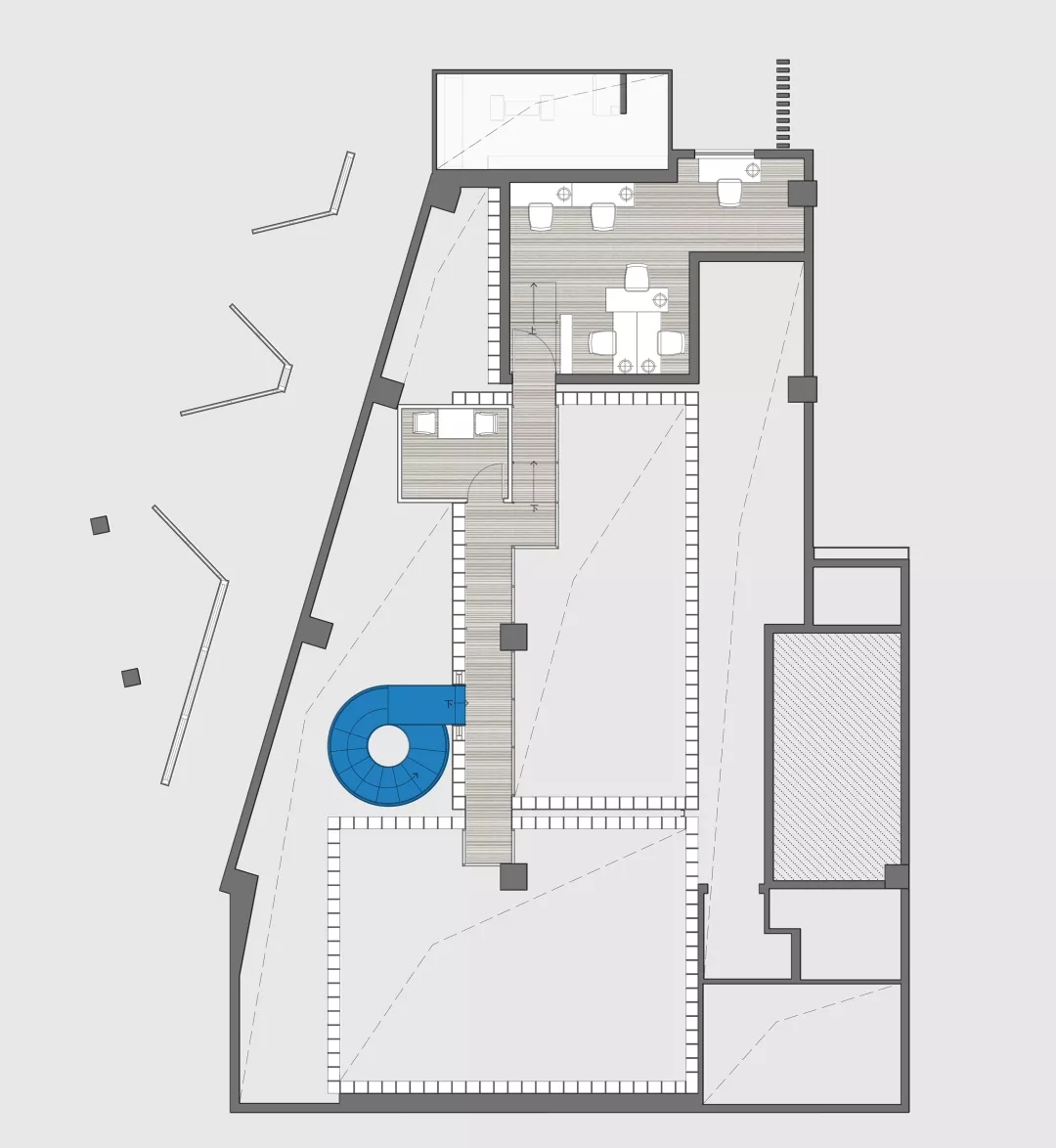 現(xiàn)場是個不規(guī)則的平面,如果排除未來可復制性,就著形狀設計并無不可,但這就缺乏了示范性意義。設計師按照客廳研究成果,在這個不規(guī)則平面最大極限設置了三個盒子,一個是功能性的,一個是社交性的,一個是女性的。如果把不規(guī)則的場地看成是一座城,這三個盒子就是內(nèi)城,而他們之間不規(guī)則的剩余空間可以自由定義的場所。