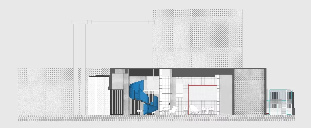 我們設計了一個夾層走廊隱藏在書架上.在課題研究中如何利用層高一直是房產(chǎn)商關心的,以我的實際經(jīng)驗,凈高2.1米仍然具有一定舒適度。在本案中,原本懸在社交盒子上的麻將房因為一樓層高過低無法成立,于是我們直接切斷,形成一個小陽臺作為暗示。