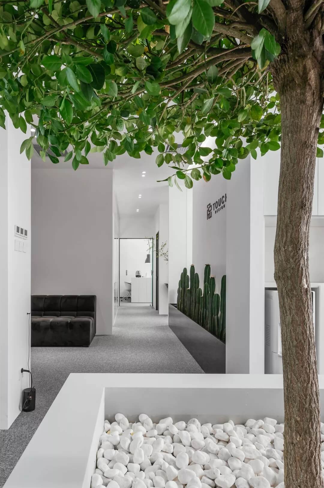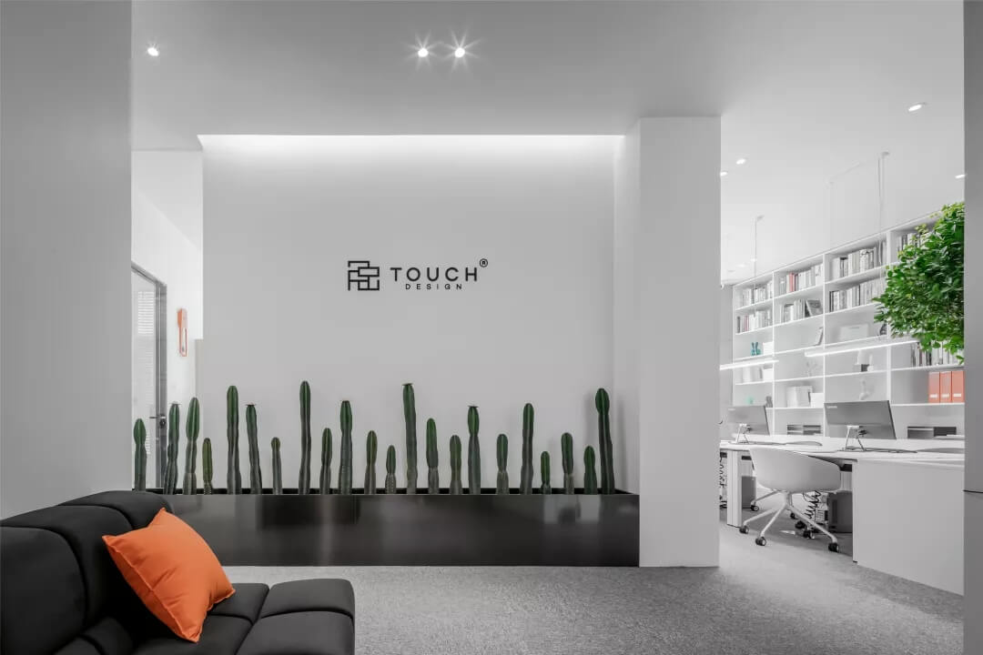 刪繁就簡,以最經(jīng)典的白色為主題搭配色調,沒有繁瑣的辦公室設計和過多的裝飾,減去辦公中的壓抑感。通過將自然純凈的白色與沉靜黑色相結合,將品牌形象簡潔地呈現(xiàn)表達,同時為左右空間的過渡創(chuàng)建和諧觀感。純白的墻面,接近心靈的澄凈;仙人掌是視覺的焦點,恣意生長、堅韌、夯實根基,也正寓意著公司的設計理念:有所依、有所仗、有所長。