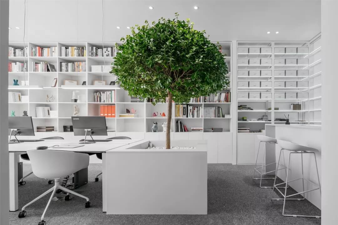在這里,未知的一切與既有的常識記憶產(chǎn)生傳導,想象思維的觸角開始蔓延。小株綠樹分隔出挑高的白色高座式二人桌,提供了一種更為隨性、更利于面對面交流的辦公形式。