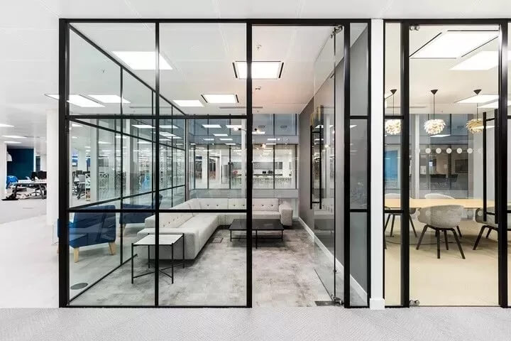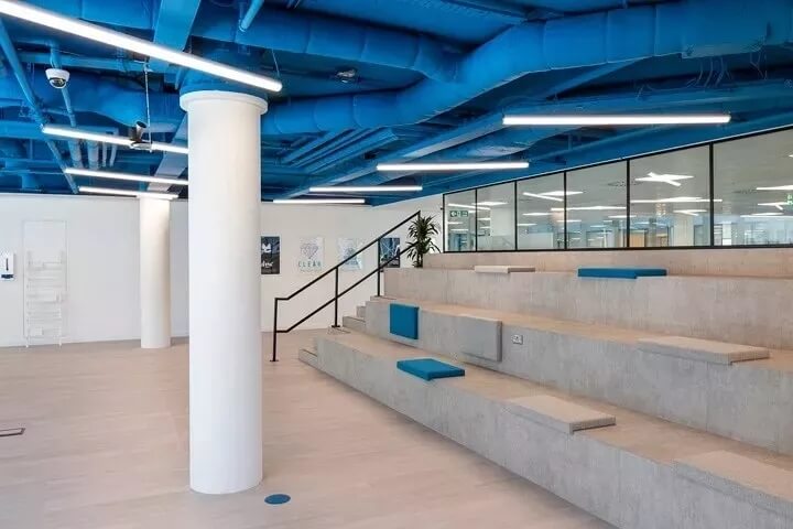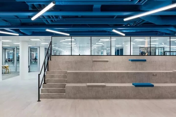 特點(diǎn):科技,總部、英國、斯堪的納維亞設(shè)計(jì)風(fēng)、寧靜自然簡約、灰色、藍(lán)色頂面、水泥質(zhì)感、看臺式階梯座、車廂座、玻璃隔斷