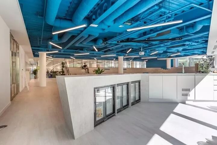 本案最令人贊嘆的創(chuàng)意構(gòu)思是與接待區(qū)相連的休閑區(qū)的藍(lán)色頂面設(shè)計(jì),藍(lán)色是公司的標(biāo)識色,除了這里也點(diǎn)綴于會議空間和靈動(dòng)的工作區(qū)。裸露的頂面和設(shè)備管道都統(tǒng)一在純凈的藍(lán)色之中。這里不僅用于接待訪客同時(shí)也是大型集會、交流協(xié)作和派對活動(dòng)之地。