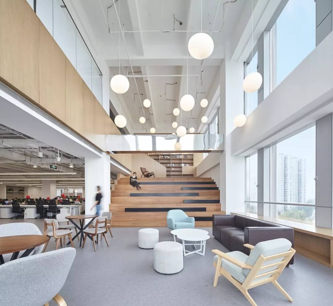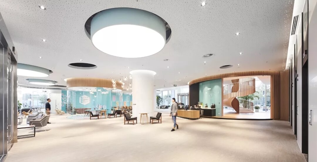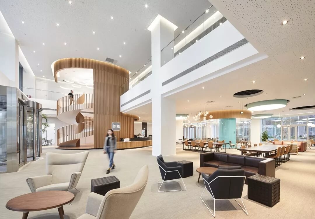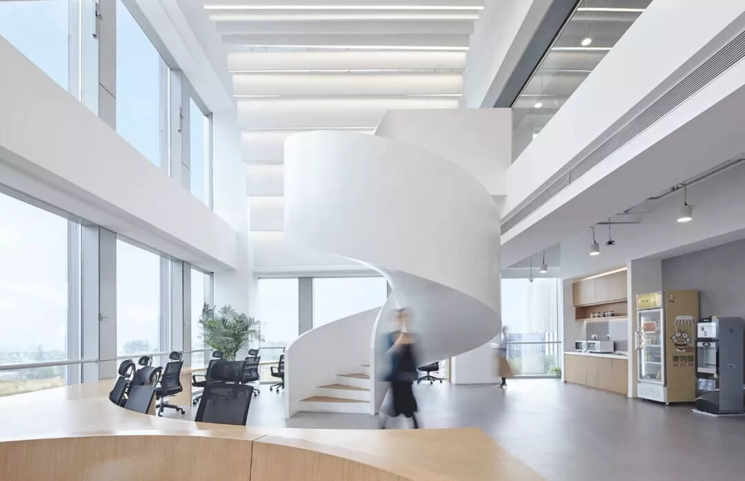 都市客廳島,選擇流暢線條的螺旋樓梯貫穿上下,運(yùn)用條形面板錯(cuò)縫排列成弧形的照明方式,使整個(gè)空間照度均勻,且條形面板亦可作為裝飾展示面。家居軟裝選用極簡風(fēng)格,流線組擺方式,營造自由靈活的空間,促進(jìn)員工間的交流和溝通。