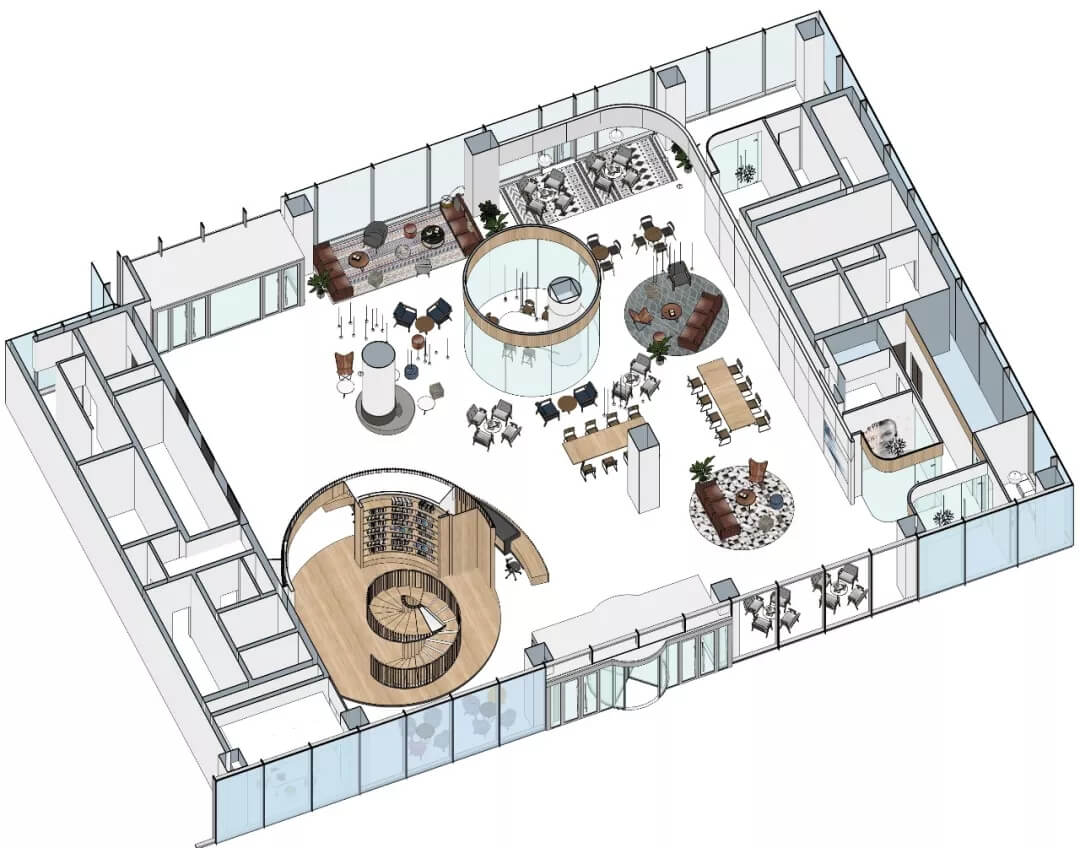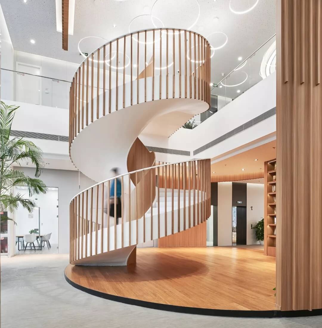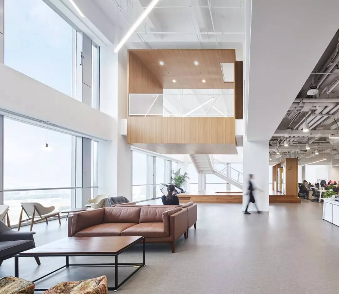 都市客廳島,選擇流暢線條的螺旋樓梯貫穿上下,運(yùn)用條形面板錯(cuò)縫排列成弧形的照明方式,使整個(gè)空間照度均勻,且條形面板亦可作為裝飾展示面。家居軟裝選用極簡風(fēng)格,流線組擺方式,營造自由靈活的空間,促進(jìn)員工間的交流和溝通。