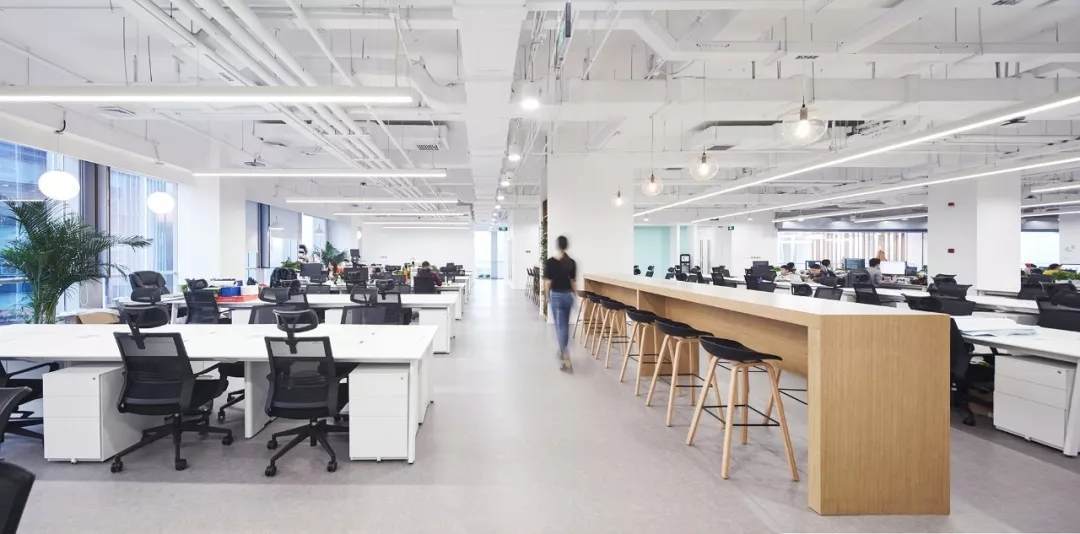 設(shè)計(jì)師在開放式的辦公區(qū)域設(shè)置長條吧臺(tái)桌,供員工自由討論辦公,午間用餐等,同時(shí)開放辦公區(qū)與南側(cè)公共島空間相連,員工可攜帶筆記本在這里沐浴著陽光辦公,討論,商務(wù)洽談,休憩等。