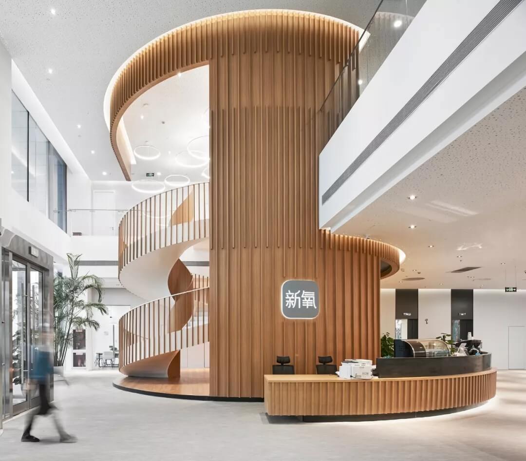 美麗生活館中最矚目的是兩個(gè)圓柱體空間模塊,一個(gè)是貫穿1-2層的木格柵旋轉(zhuǎn)樓梯,半開半包,與咖啡館及接待臺(tái)合嵌為一體,溫馨,時(shí)尚,樓梯的內(nèi)側(cè)展示新氧的榮譽(yù)勛章;一個(gè)是透明的柱狀空間,以靜態(tài)裝置的方式展示新氧文化,周圍布置洽談交流座椅;大堂南側(cè)用文化墻隔出開放的休閑洽談區(qū)和面試及收發(fā)室的圍合空間。