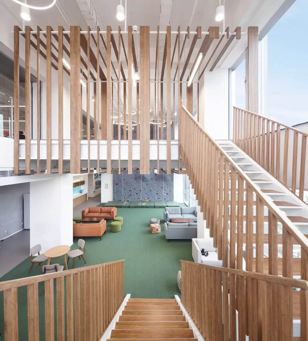 綠籬奇跡島,是自然,健康運(yùn)動(dòng),挑戰(zhàn)自我的主題公共空間。木質(zhì)格柵樓梯在二層延伸出一個(gè)通透的格柵BOX,形成豐富的空間層次和視覺高差。同時(shí)設(shè)置攀巖墻,瑜伽室和健身房,展現(xiàn)新氧人不懼挑戰(zhàn),運(yùn)動(dòng)健康的生活方式。