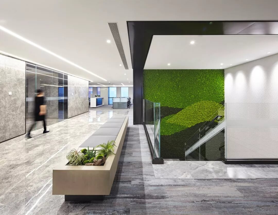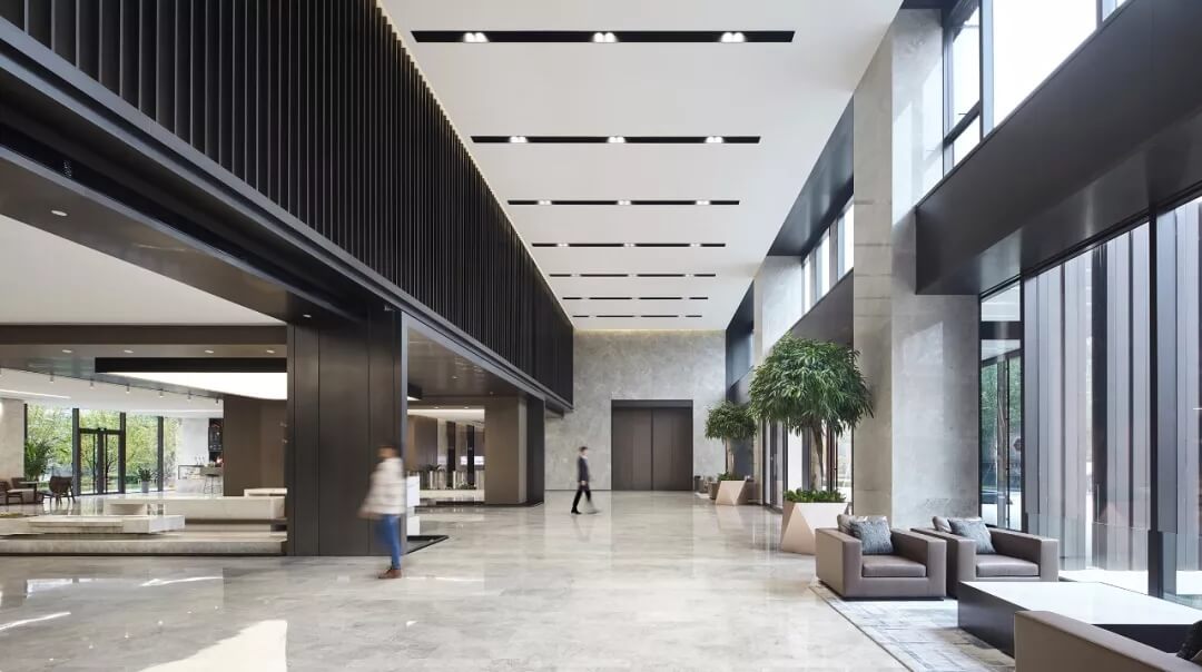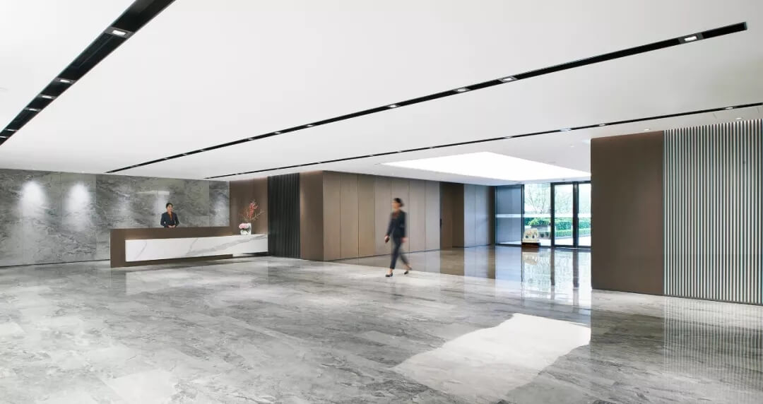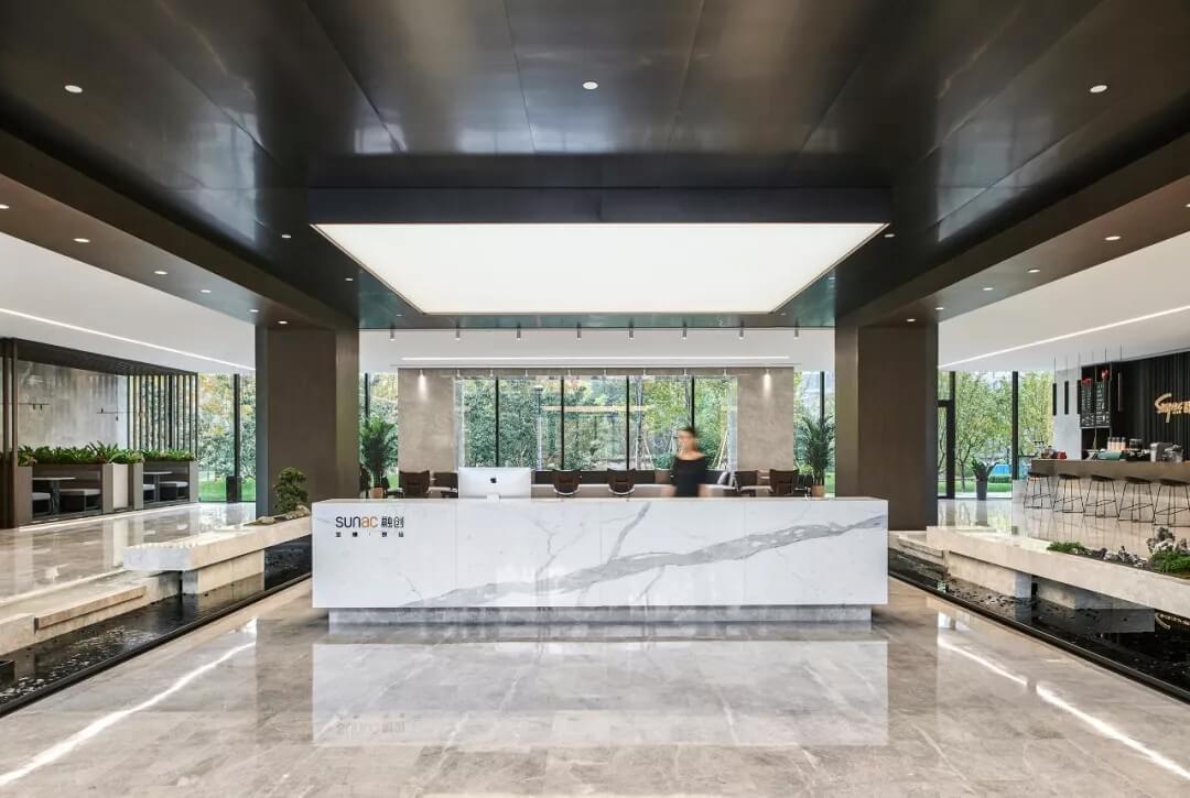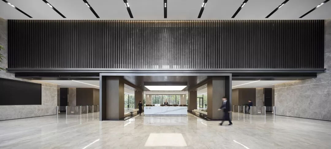 大堂是開放,通透,自然的園林式空間,自成一片天地。踏入大堂即可看到前廳接待島,方形四面通透的造型,嚴(yán)謹(jǐn)不失靈活,結(jié)合流動水景和盆景,營造了生態(tài)的,四季怡情的綠色辦公。電梯廳出入口在接待島兩側(cè),實(shí)現(xiàn)快速集散,避免上下班高峰期等候擁堵??Х鹊群騾^(qū)玻璃窗形成框景,把室外花園內(nèi)的四季變幻,自然元素都納入到室內(nèi)來,形成情景共融。