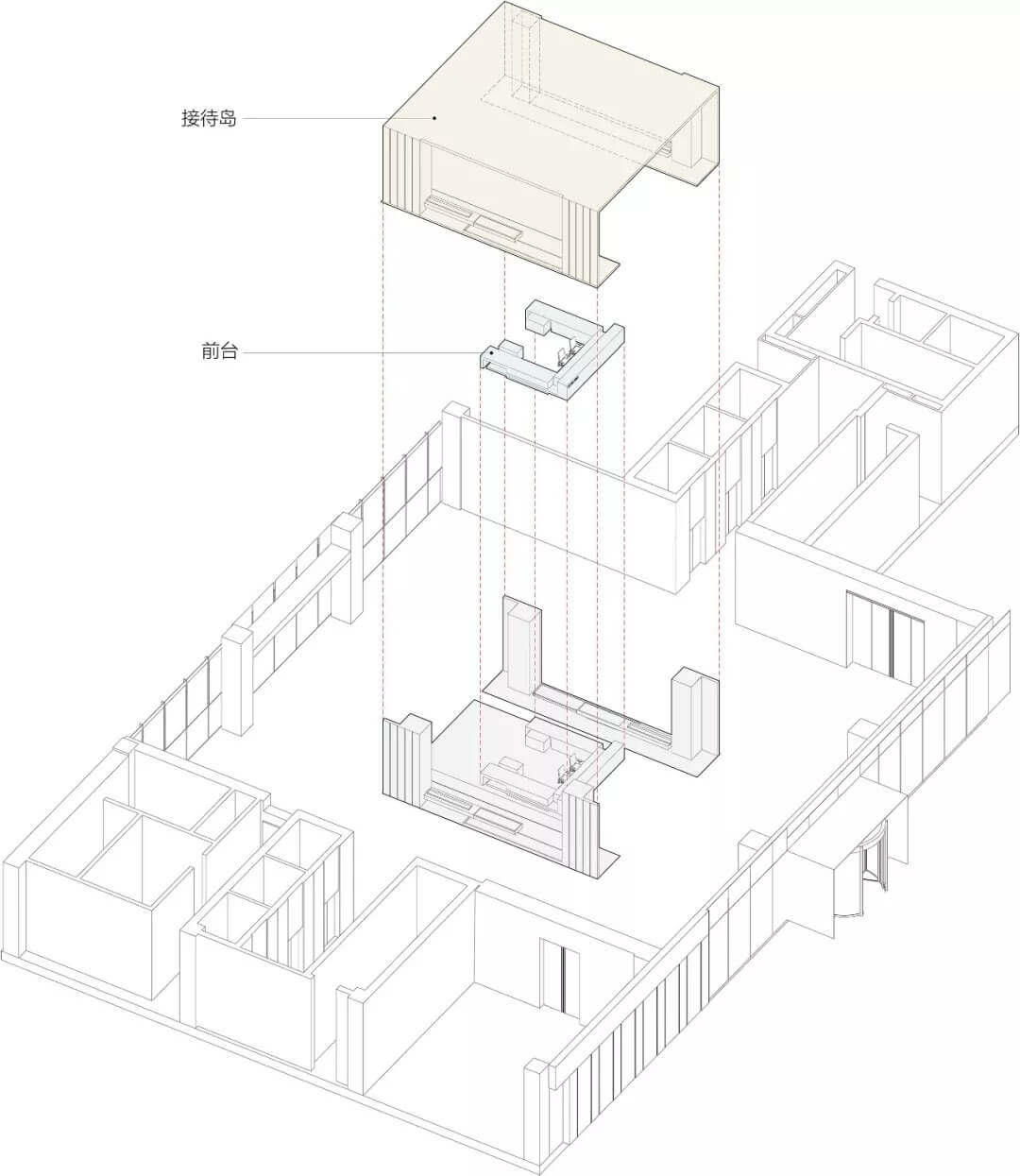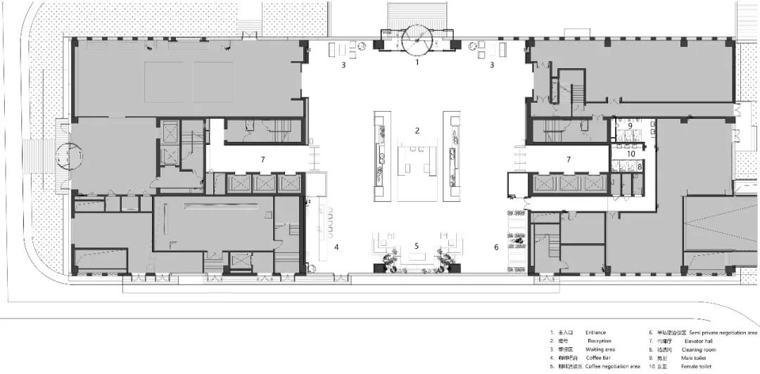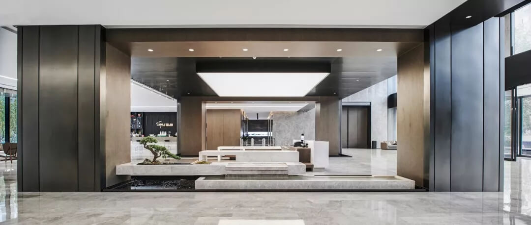 設(shè)計(jì)師通過空間布局,材料選用等營造出大堂沉靜務(wù)實(shí)、理性的空間氛圍,咖啡,水聲,盆景,窗外的花園,以及往來的員工,客戶和行人賦予這里靈魂和氣息,使整個大堂充滿各種可能性。
