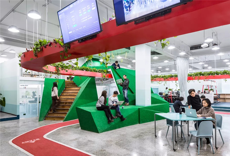 5個公司由一個中間懸掛的“紅環(huán)”聯(lián)系在一起,紅環(huán)上種植蔬菜與植物,下面對應(yīng)的是跑道。員工在跑道健步的同時可以打電話,也可以與照料植物的同事進(jìn)行交談。