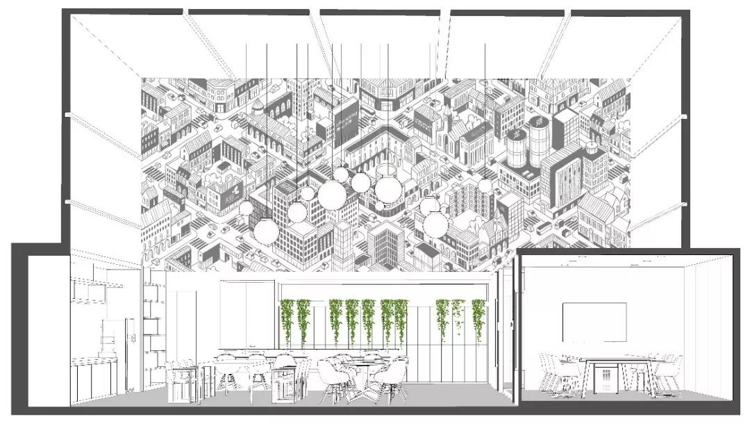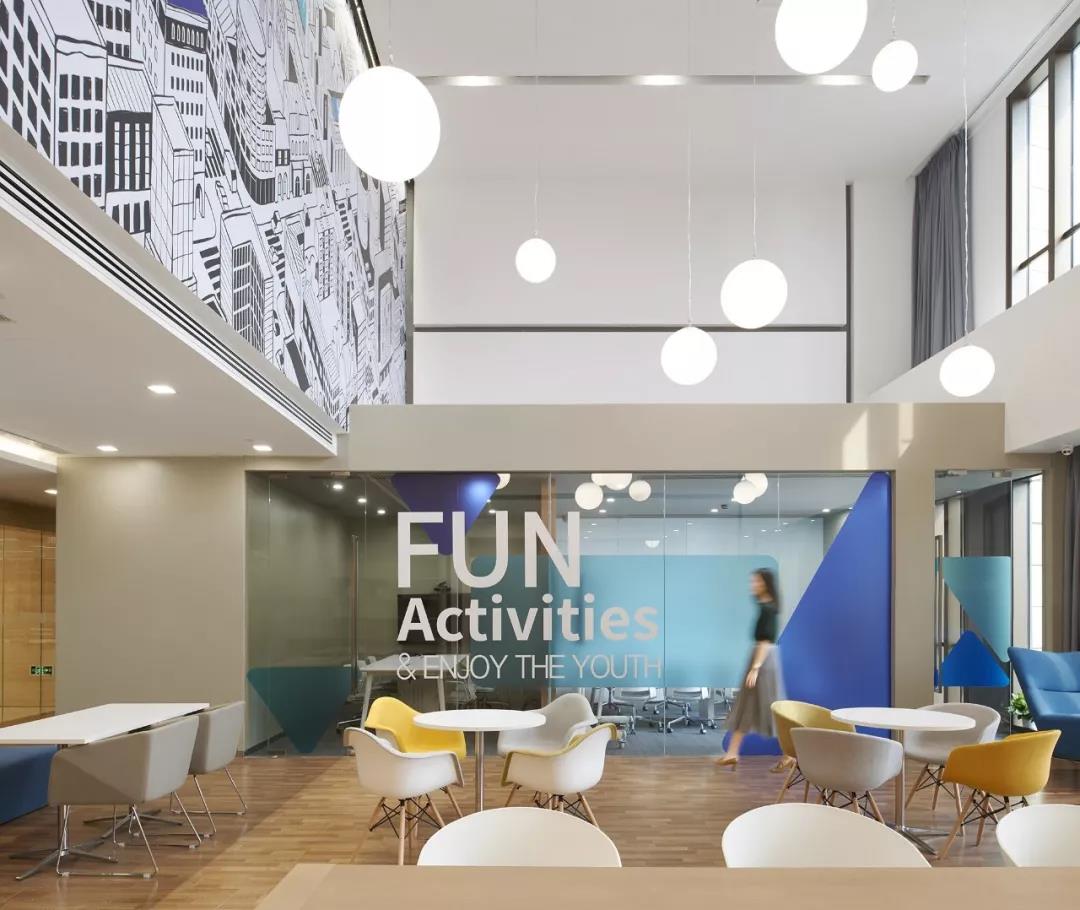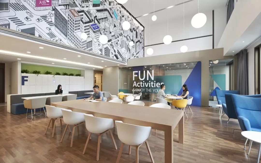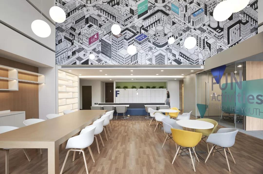 南側(cè)挑高區(qū)的空間定義為“城市客廳”,視覺感受區(qū)別于北區(qū)的咖啡主題,更加明快現(xiàn)代,為整個辦公區(qū)帶來時尚、活躍、靈動的感受。“活力城市”的軸側(cè)插畫裝點了整個挑高區(qū)二層墻面,龍湖重點產(chǎn)品的標識隱含其中,傳達出龍湖精彩紛呈的產(chǎn)品類型和高品質(zhì)特征。