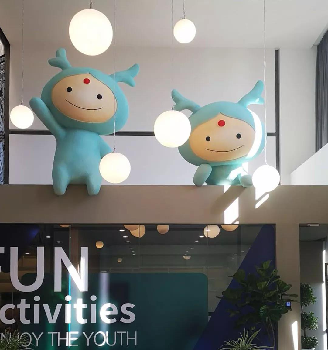 此區(qū)域另外的一個亮點是在會議室頂端利用空間設置了“龍小湖”巨型卡通造型,同此空間的人招手互動,為空間帶來了一種親和的童趣。也是傳達龍湖企業(yè)形象的一處絕佳空間。