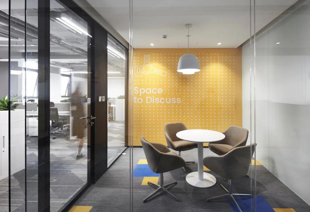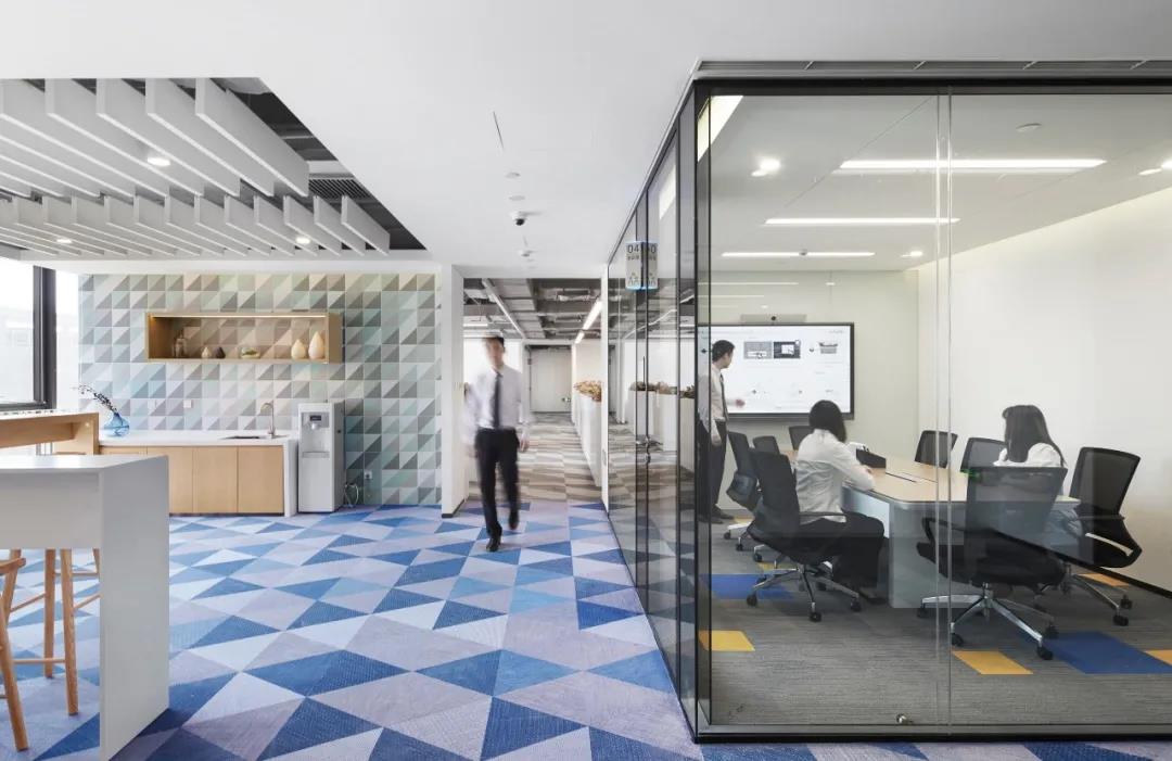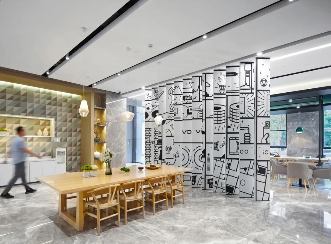 采用低飽和度的幾何圖樣壁紙,將vivo工業(yè)園,東莞總部,重慶vivo的建筑外形提煉出元素與洽談室巧妙結(jié)合,增強(qiáng)vivo的空間專屬性和親切性。