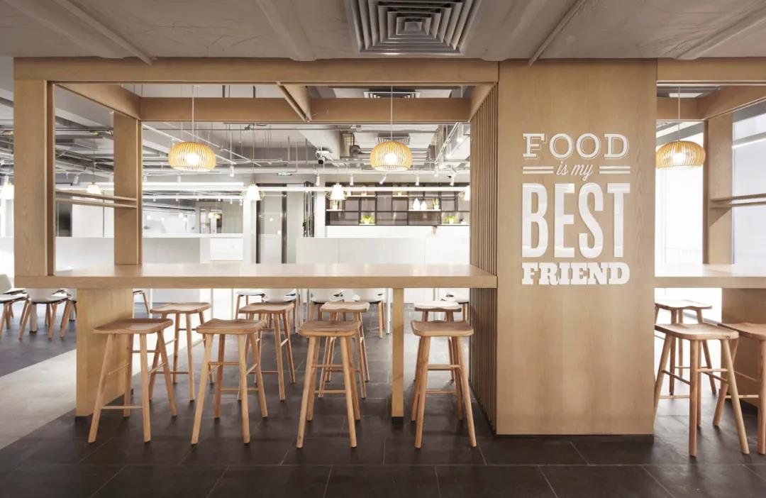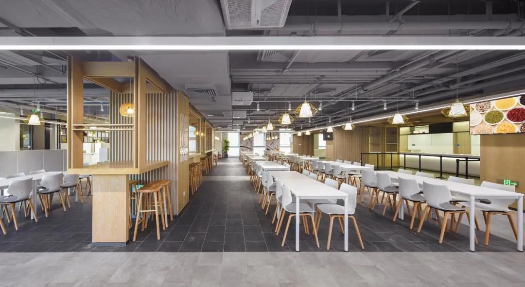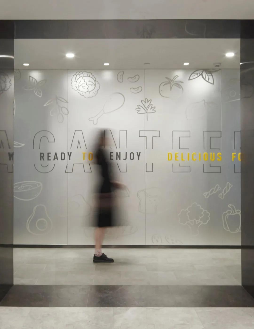 不同于其他辦公樓餐廳布置在地下層,vivo以三層作為生活服務(wù)區(qū),集中布局健身和餐廳,方便管理并對(duì)其他辦公層影響較少。餐廳入口使用磨砂鏡彩繪圖案,指示清晰,內(nèi)部通過地面鋪磚、桌椅組擺等方式設(shè)置出等候,取餐,就餐,收盤等交通動(dòng)線,維護(hù)空間秩序,營造出輕松舒適整潔的就餐環(huán)境。