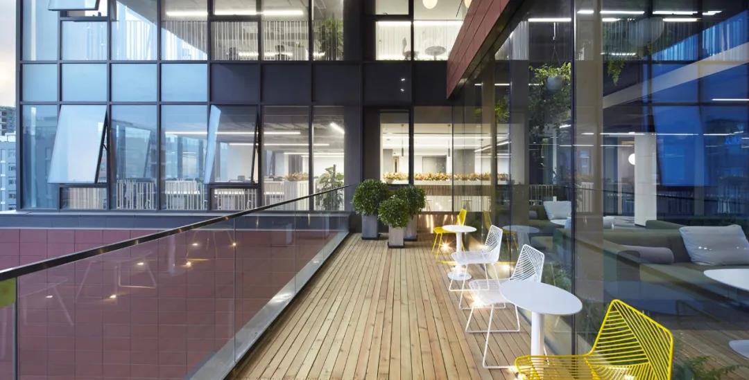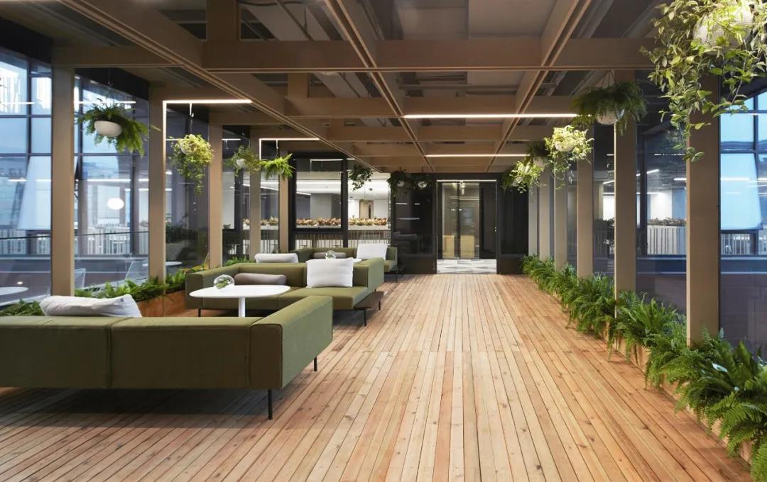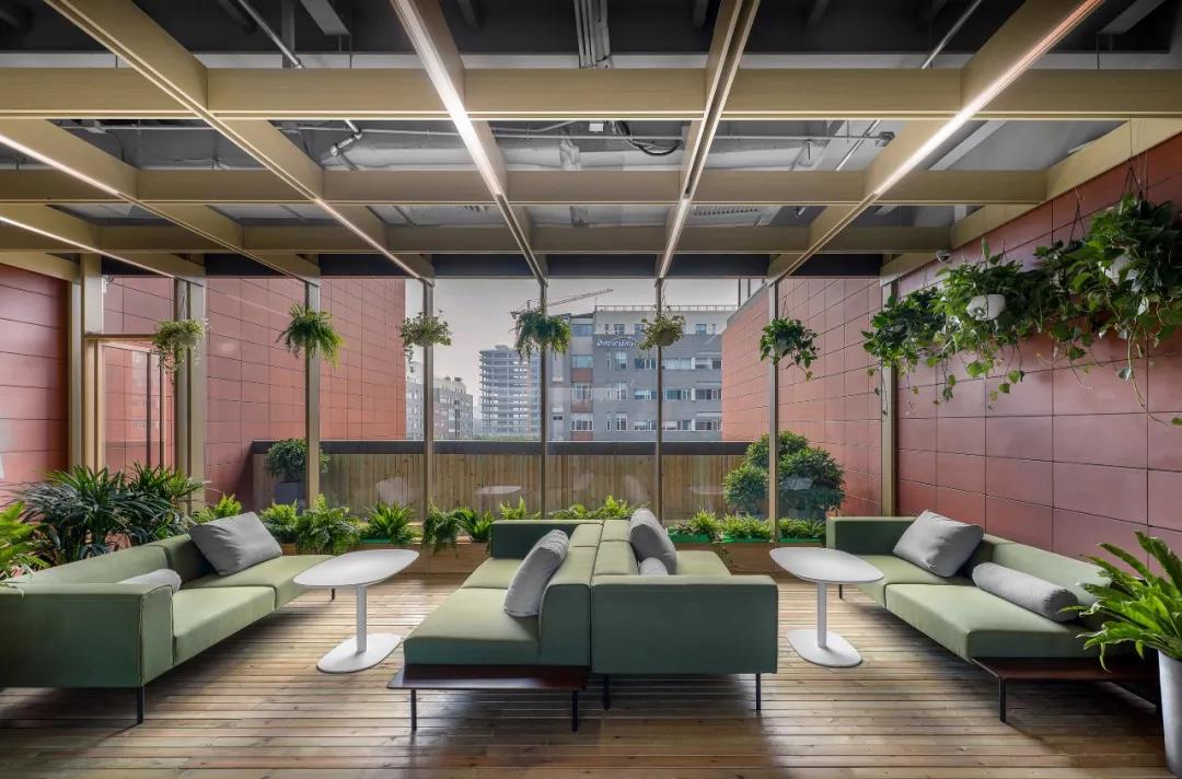 在建筑中段的4-6層,是一處半室外的連橋空間。通過結(jié)構(gòu)適度改造營建了三個(gè)疊落的空中花房,同時(shí)每個(gè)花房都配有戶外露臺(tái)作為空間延展。矩陣型木質(zhì)天花延伸到側(cè)墻并落地,地面鋪防腐木條,整個(gè)空間配備綠植,營造輕松、生態(tài)的戶內(nèi)外休憩空間,同時(shí)還可作為研討,舉辦小型活動(dòng)的多功能空間使用。
