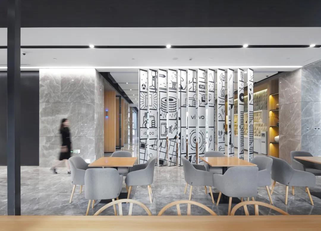 大堂作為整體的對(duì)外開放和形象展示空間,配備了咖啡,休閑茶水,展廳,洽談,會(huì)議等開放的功能性空間,配以圖像視覺傳達(dá)設(shè)計(jì),軟植入vivo品牌精神。