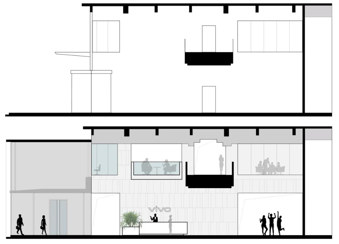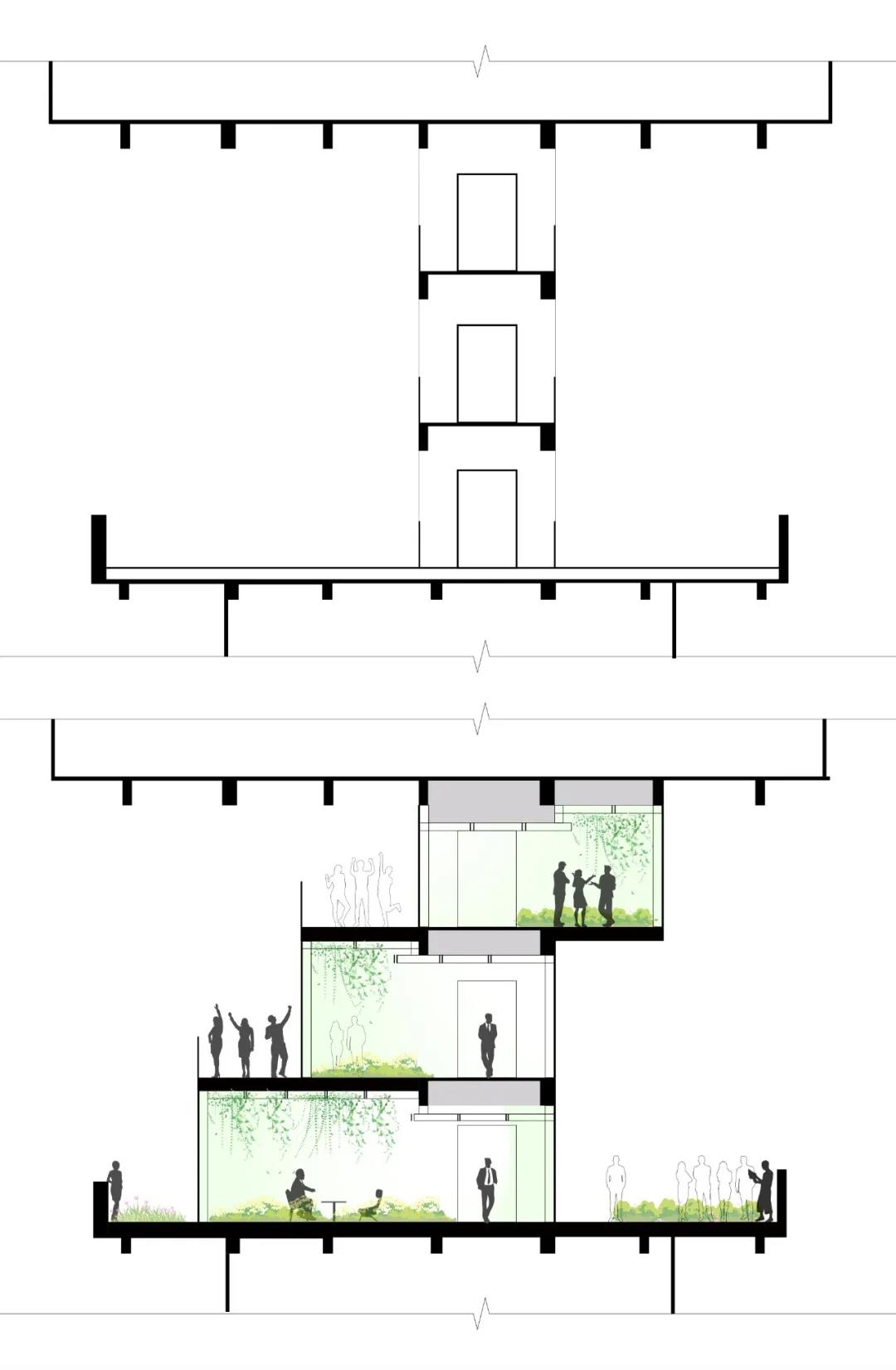 ▲連廊改造前后 剖面對(duì)比圖